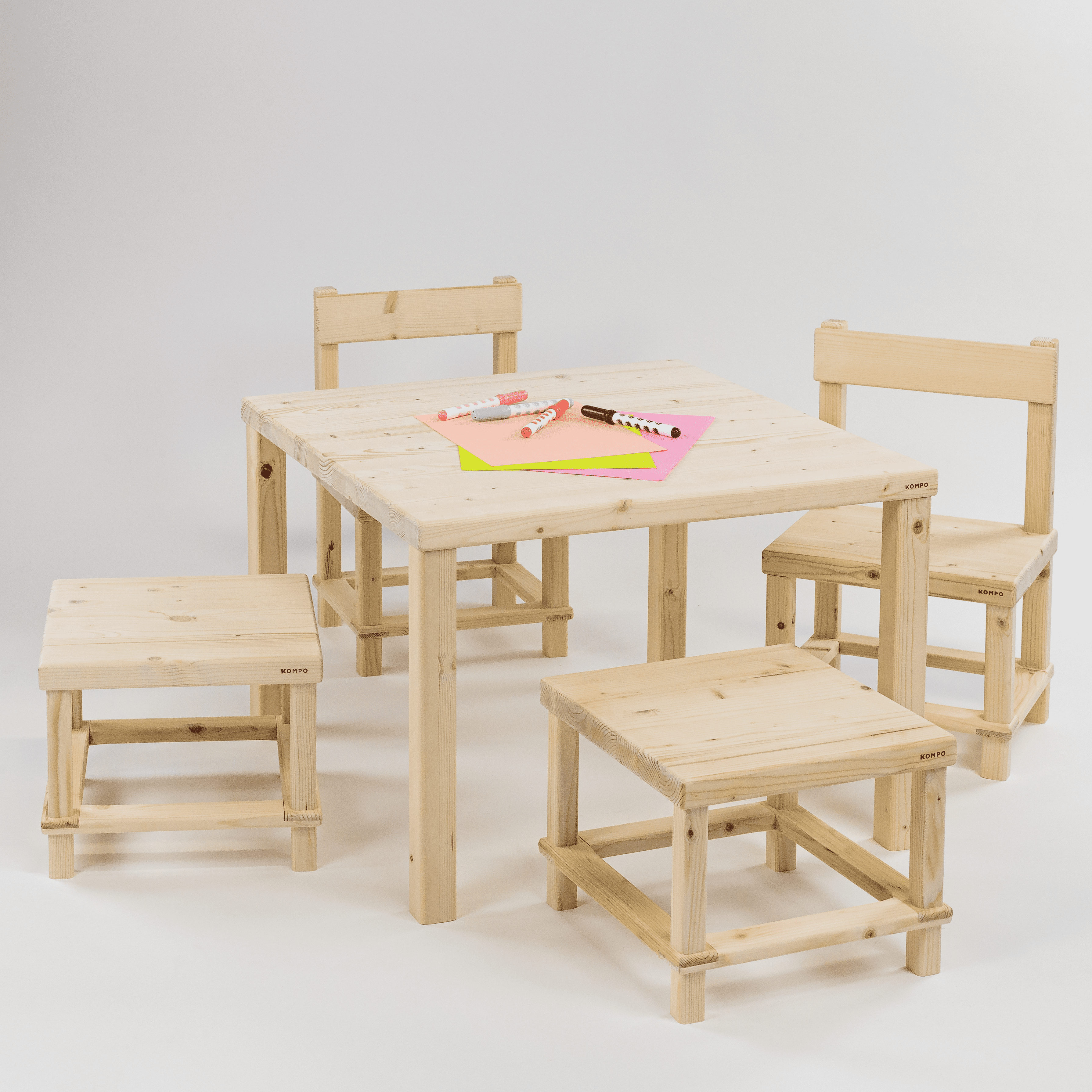Il set pensato per creare uno spazio in casa completamente dedicato alle attività dei più piccoli: Tavolo Kids, altro solo 42 cm, in legno robusto e resistente, con gli angoli smussati, accompagnato da 4 sedute a scelta tra Sgabelli Kids e Sedie Kids. Classico e funzionale!